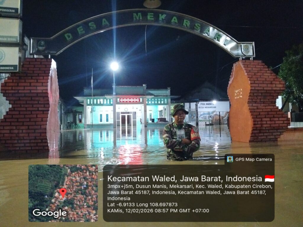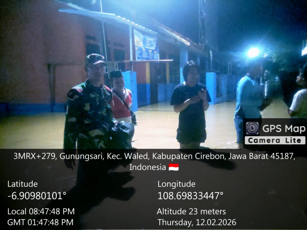 Cirebon, 12 Februari 2026 — Hujan deras yang mengguyur wilayah Kabupaten Cirebon pada Kamis (12/2/2026) sejak sore hari mengakibatkan meluapnya Sungai Ciberes dan menyebabkan banjir di wilayah Koramil 0620-08/Waled. Hingga pukul 19.30 WIB sampai dengan saat ini, debit air masih mengalami kenaikan.