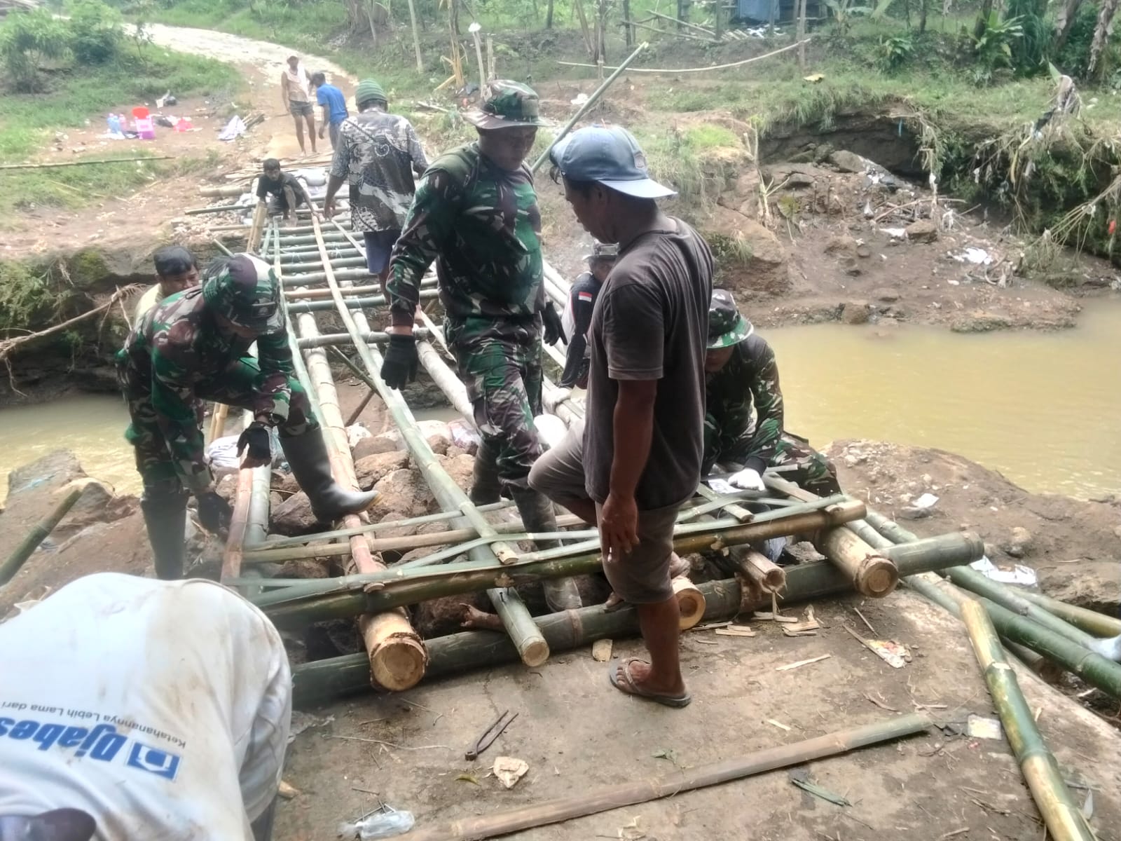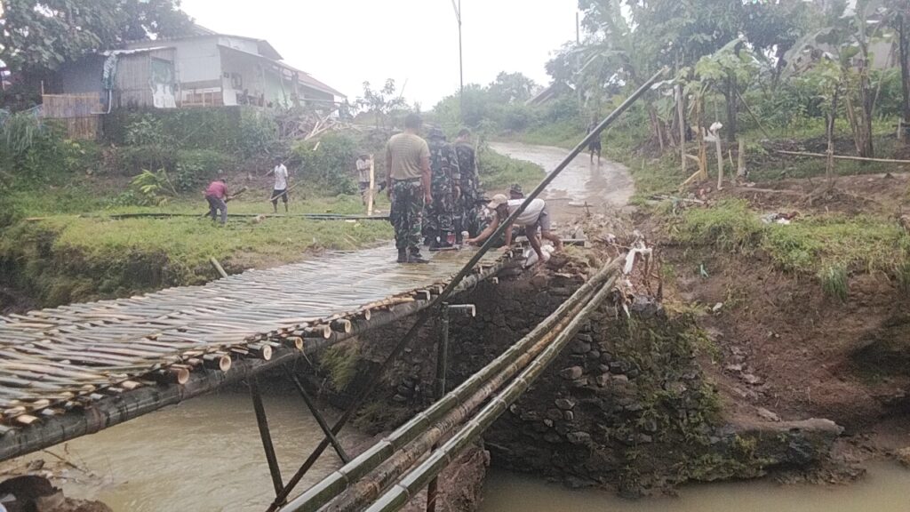 Sebagai langkah cepat, Koramil bersama masyarakat bergotong royong membangun jembatan darurat guna memulihkan akses sementara antara kedua desa.